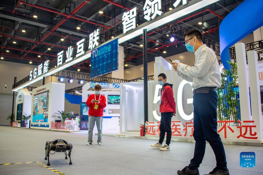 A visitor takes photos of a cyberdog at China 5G+ Industrial Internet Conference in Wuhan, central China's Hubei Province, Nov. 20, 2021. China 5G+ Industrial Internet Conference runs from Nov. 19 to 21. (Photo by Wu Zhizun/Xinhua)