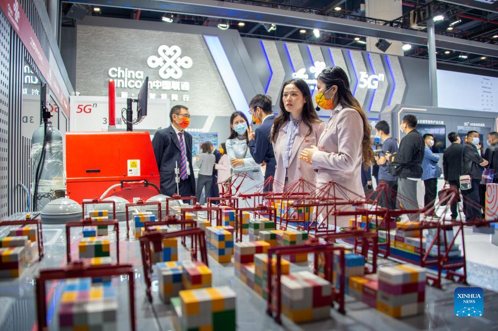 Visitors view models at China 5G+ Industrial Internet Conference in Wuhan, central China's Hubei Province, Nov. 19, 2021. China 5G+ Industrial Internet Conference runs from Nov. 19 to 21. (Photo by Wu Zhizun/Xinhua)
