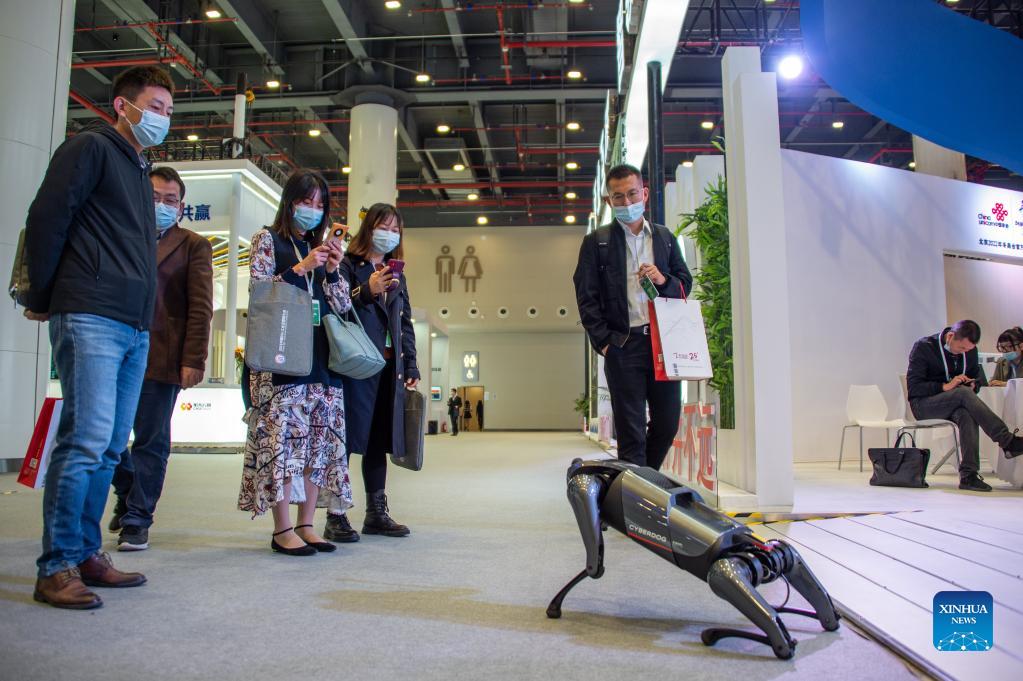 Visitors interact with a cyberdog at China 5G+ Industrial Internet Conference in Wuhan, central China's Hubei Province, Nov. 20, 2021. China 5G+ Industrial Internet Conference runs from Nov. 19 to 21. (Photo by Wu Zhizun/Xinhua)