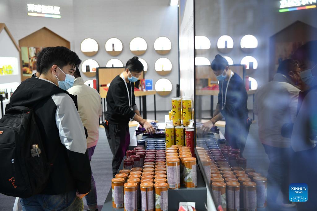 Visitors shop at the Exhibition of Import Commodity during the fourth World Manufacturing Convention in Hefei, capital of east China's Anhui Province, Nov. 20, 2021. The fourth World Manufacturing Convention kicked off Friday in Hefei. The four-day event, themed "innovation-driven, digitally empowered: global manufacturing industry aligned for high-quality growth," aims to promote high-quality manufacturing and deepen exchanges between China and the rest of the world. (Xinhua/Zhang Duan)