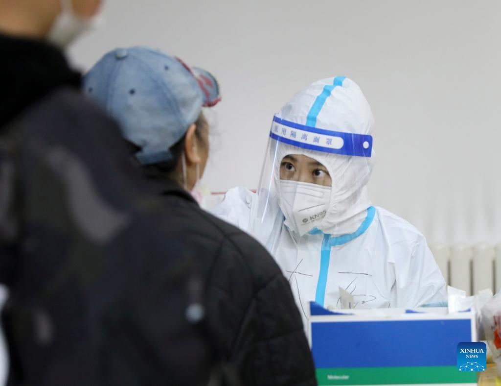 A medical worker takes a swab sample from a resident for nucleic acid test at a testing site in Dalian, northeast China's Liaoning Province, Nov. 17, 2021. (Xinhua/Yao Jianfeng)