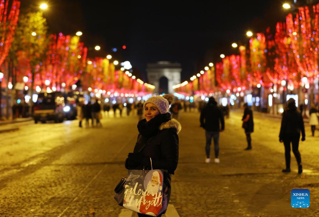 A woman poses for a photo on the Champs-Elysees Avenue amid Christmas illuminations in Paris, France, Nov. 21, 2021. The annual Christmas season lighting ceremony was held here on Sunday. (Xinhua/Gao Jing)