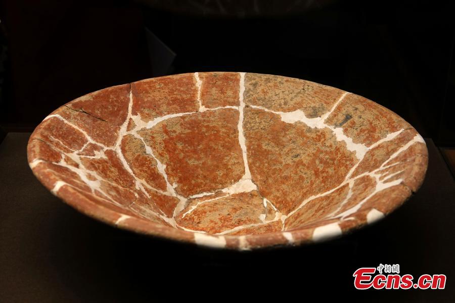A pottery basin is on display at an exhibition themed on Shangshan Culture (around 11,000-8,500 years ago) at the National Museum of China in Beijing, Nov. 21, 2021. (Photo: China News Service/Sun Zifa)