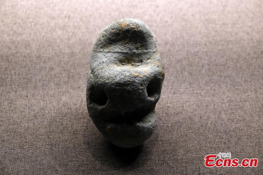 A head-shaped stone statue is on display at an exhibition themed on Shangshan Culture (around 11,000-8,500 years ago) at the National Museum of China in Beijing, Nov.21, 2021. (Photo: China News Service/Sun Zifa)
