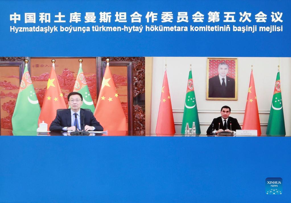 BEIJING, Nov. 22 (Xinhua) -- Chinese Vice Premier Han Zheng and his Turkmen counterpart Serdar Berdymukhamedov on Monday co-chaired the fifth meeting of the China-Turkmenistan Cooperation Committee via video link.