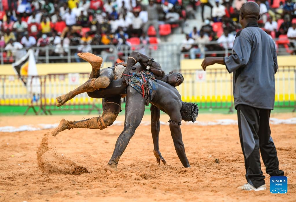 Contestants take part in a wrestling match at the National Wrestling Arena in Dakar, Senegal, Nov. 21, 2021. The arena, the first modern one in Africa, is the largest aid project China has carried out in Senegal. (Xinhua/Li Yan)
