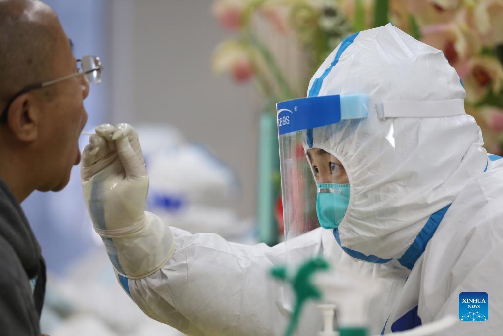 A medical worker takes a swab sample from a resident for nucleic acid test at a testing site in Dalian, northeast China's Liaoning Province, Nov. 17, 2021.(Xinhua/Yao Jianfeng)