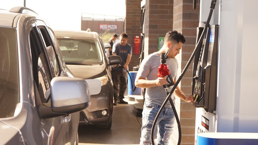 People fuel vehicles at a gas station in Los Angeles, California, the United States, on Nov. 15, 2021. (Photo by Zeng Hui/Xinhua)