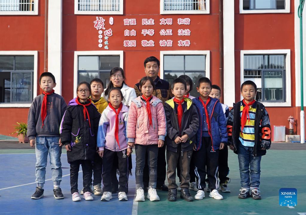 Zhu Bo (L, middle) and his wife Luo Hua, both teachers, pose for a group photo with students at Changfeng School in Luxi County, east China's Jiangxi Province, Nov. 18, 2021. Changfeng School sits deep in the Luoxiao Mountains. Among its 30 teachers, there are six couples. For the 170 students in the school, these couples are not only teachers teaching them knowledge but more like parents taking care of lower graders and boarding students. Wang Jingming, 46, is a chemistry teacher. In 2004, he married Deng Jun, a math teacher at the school. "We have a deep affection for the kids here and we are happy to witness their growth," said Wang. "We are willing to spend our whole lives guarding this school and protecting these kids in the mountains, hoping they can have a wonderful life." (Xinhua/Wan Xiang)