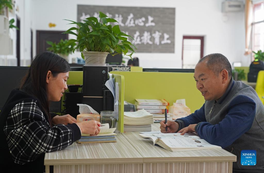 Lai Hangyun (R) and her husband Liu Zengguang, both teachers, prepare their lessons at Changfeng School in Luxi County, east China's Jiangxi Province, Nov. 18, 2021. Changfeng School sits deep in the Luoxiao Mountains. Among its 30 teachers, there are six couples. For the 170 students in the school, these couples are not only teachers teaching them knowledge but more like parents taking care of lower graders and boarding students. Wang Jingming, 46, is a chemistry teacher. In 2004, he married Deng Jun, a math teacher at the school. "We have a deep affection for the kids here and we are happy to witness their growth," said Wang. "We are willing to spend our whole lives guarding this school and protecting these kids in the mountains, hoping they can have a wonderful life." (Xinhua/Peng Zhaozhi)