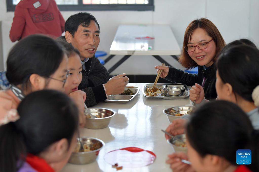 Li Zhigang (L, rear) and his wife Li Jianzhen (R, rear), both teachers, have lunch with students at Changfeng School in Luxi County, east China's Jiangxi Province, Nov. 18, 2021. Changfeng School sits deep in the Luoxiao Mountains. Among its 30 teachers, there are six couples. For the 170 students in the school, these couples are not only teachers teaching them knowledge but more like parents taking care of lower graders and boarding students. Wang Jingming, 46, is a chemistry teacher. In 2004, he married Deng Jun, a math teacher at the school. "We have a deep affection for the kids here and we are happy to witness their growth," said Wang. "We are willing to spend our whole lives guarding this school and protecting these kids in the mountains, hoping they can have a wonderful life." (Xinhua/Peng Zhaozhi)