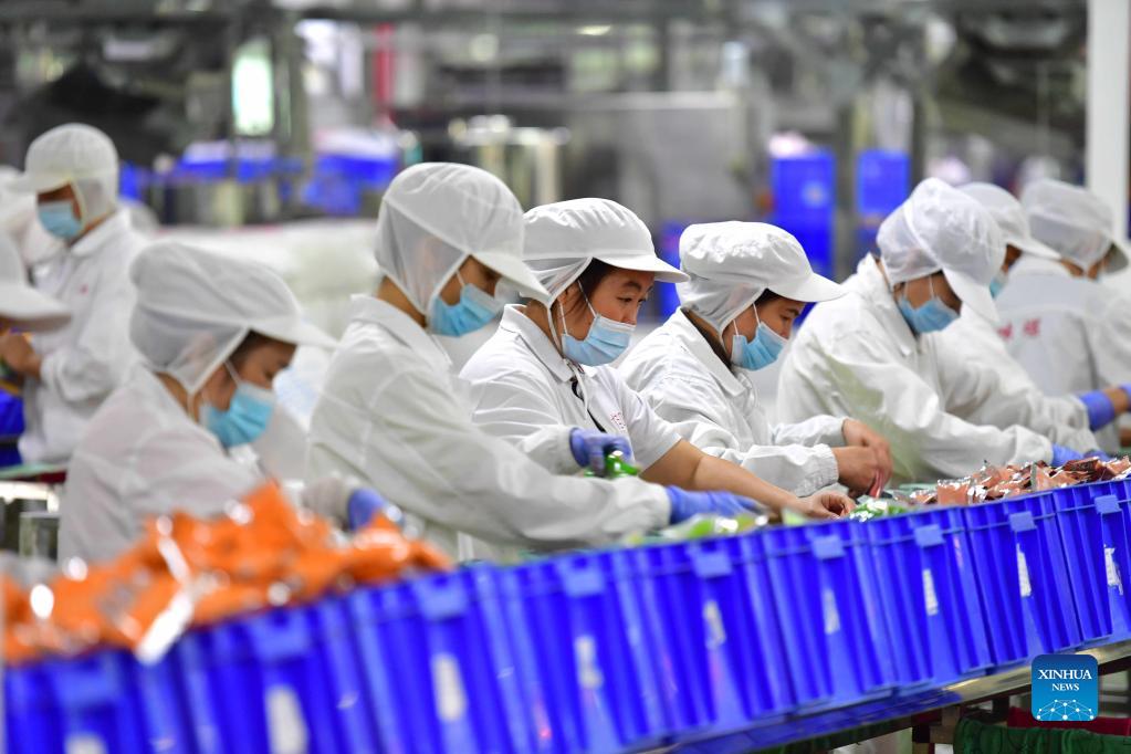 Workers pack Luosifen rice noodles at a food-processing company in Liuzhou, south China's Guangxi Zhuang Autonomous Region, Nov. 23, 2021. Liuzhou Luosifen, a soup dish dubbed by some people as "durian of soup" for its strong smell, features rice vermicelli soaked in a spicy broth flavored by river snails and topped with ingredients including pickled bamboo shoots, string beans, peanuts and tofu skin. In the first three quarters of this year, bagged Liuzhou Luosifen achieved sales revenue of 11.223 billion yuan (about 1.75 billion U.S. dollars), a year-on-year increase of 45.7%. (Xinhua/Huang Xiaobang)