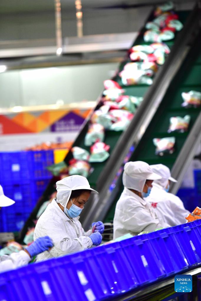 Workers pack Luosifen rice noodles at a food-processing company in Liuzhou, south China's Guangxi Zhuang Autonomous Region, Nov. 23, 2021. Liuzhou Luosifen, a soup dish dubbed by some people as "durian of soup" for its strong smell, features rice vermicelli soaked in a spicy broth flavored by river snails and topped with ingredients including pickled bamboo shoots, string beans, peanuts and tofu skin. In the first three quarters of this year, bagged Liuzhou Luosifen achieved sales revenue of 11.223 billion yuan (about 1.75 billion U.S. dollars), a year-on-year increase of 45.7%. (Xinhua/Huang Xiaobang)
