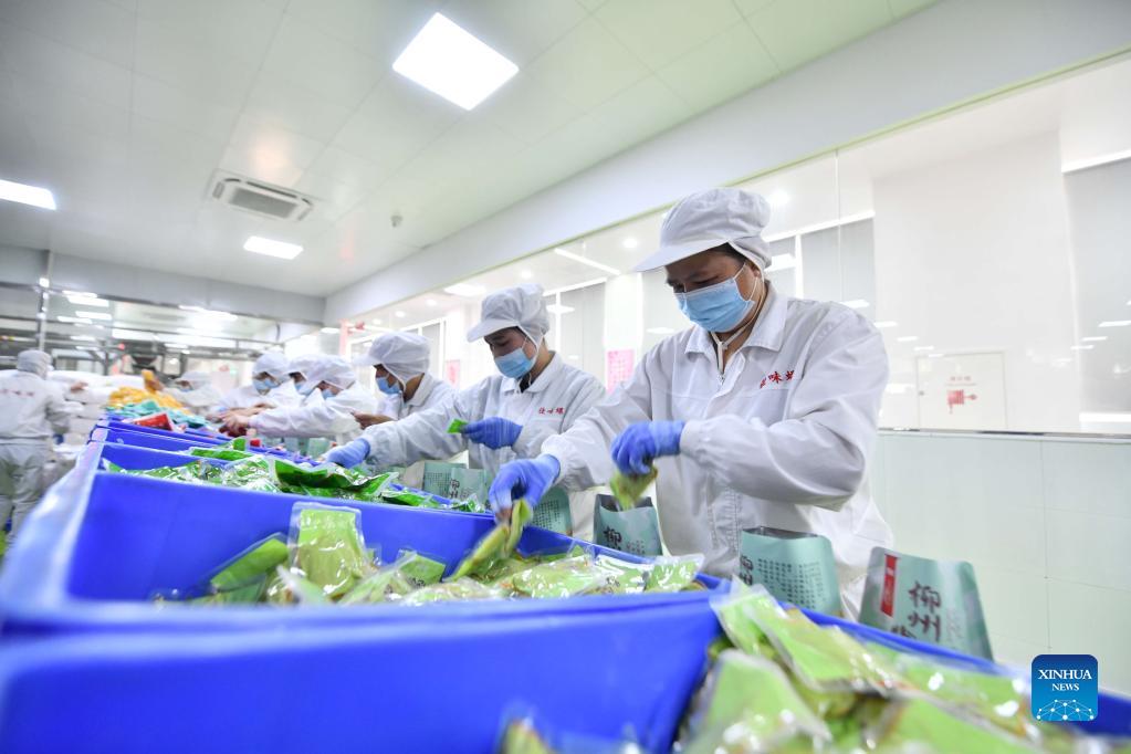 Workers pack Luosifen rice noodles at a food-processing company in Liuzhou, south China's Guangxi Zhuang Autonomous Region, Nov. 23, 2021. Liuzhou Luosifen, a soup dish dubbed by some people as "durian of soup" for its strong smell, features rice vermicelli soaked in a spicy broth flavored by river snails and topped with ingredients including pickled bamboo shoots, string beans, peanuts and tofu skin. In the first three quarters of this year, bagged Liuzhou Luosifen achieved sales revenue of 11.223 billion yuan (about 1.75 billion U.S. dollars), a year-on-year increase of 45.7%. (Xinhua/Huang Xiaobang)