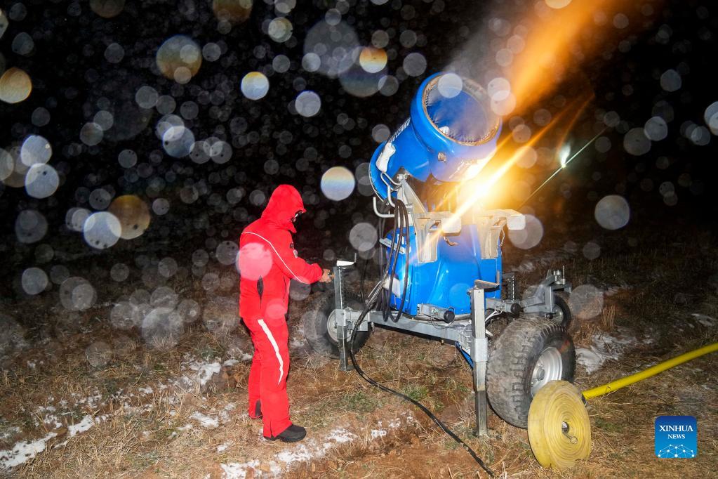 Sun Desheng checks the snowmaking machine at Changbai Mountain Ski Resort in northeast China's Jilin Province, Nov. 19, 2021. At Changbai Mountains Ski Resort, snow-making professionals as snow cannon operators, groomer drivers and snow track patrols work in cold nights in order to secure high quality of snow for visitors. As the 2022 Beijing Olympics approaches and the Chinese government encourages 300 million people to be involved in winter sports, ski resorts in China are seeing increasing visitors and providing more diversed job opportunities. (Xinhua/Xu Chang)