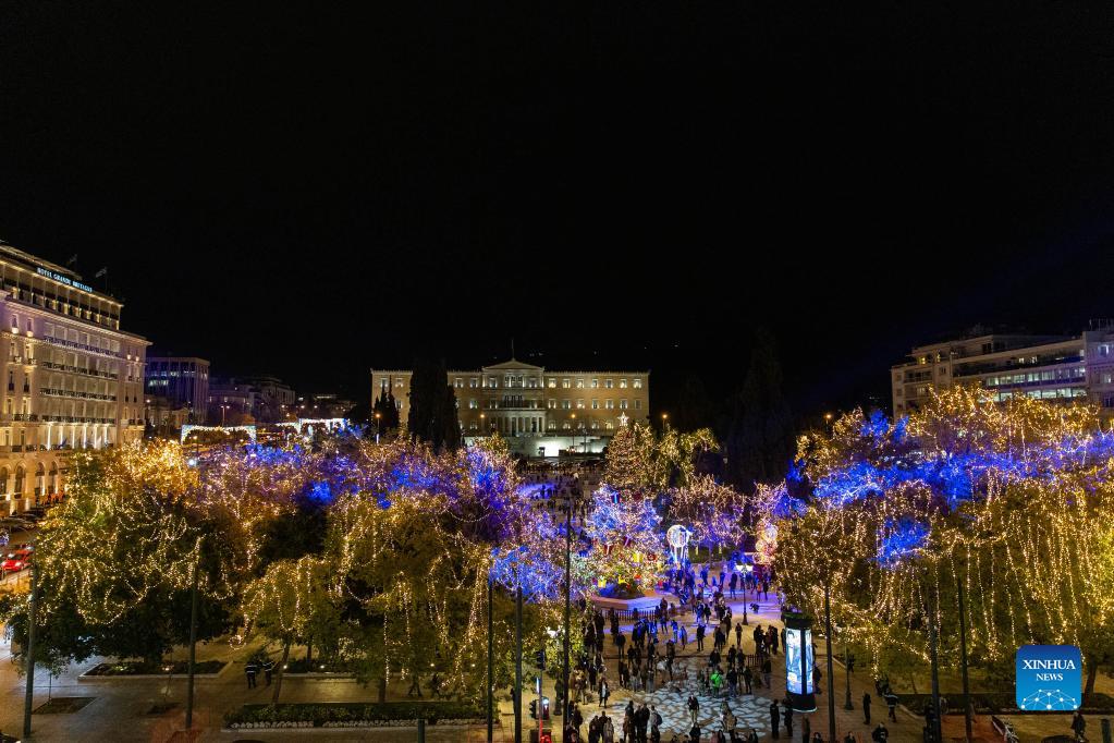 Illuminated trees with decorative lights are seen in Syntagma Square in Athens, Greece, on Nov. 23, 2021. The festive season kicked off in Athens on Tuesday evening. (Xinhua/Marios Lolos)