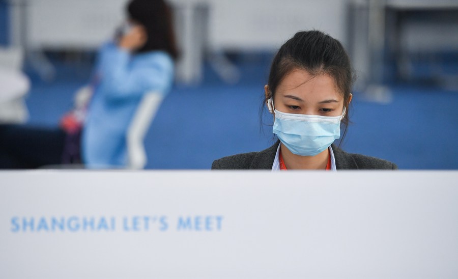 A journalist works at the Media Center of the third China International Import Expo in Shanghai, east China, on Nov. 8, 2020. (Xinhua/Chen Yehua)