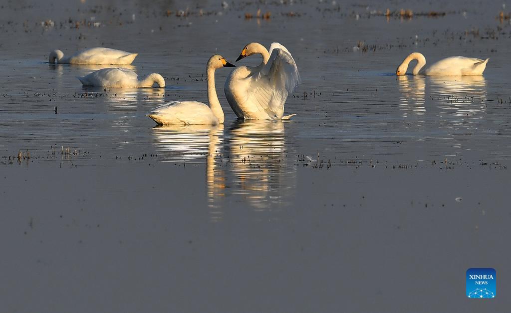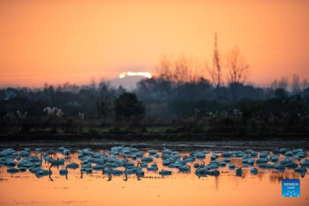 Little swans are seen at the Donggu Lake wetland of the Quyuan administration area in Yueyang City, central China's Hunan Province, Nov. 23, 2021. About 3,000 little swans have arrived at the Donggu Lake wetland of the Quyuan administration area in Yueyang for wintering. (Xinhua/Zhao Zhongzhi)
