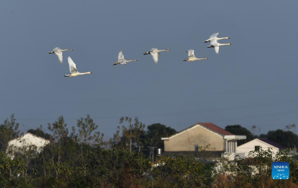 Little swans fly over houses in the Quyuan administration area in Yueyang City, central China's Hunan Province, Nov. 23, 2021. About 3,000 little swans have arrived at the Donggu Lake wetland of the Quyuan administration area in Yueyang for wintering. (Xinhua/Chen Sihan)