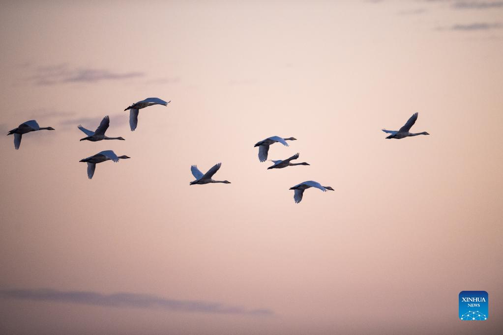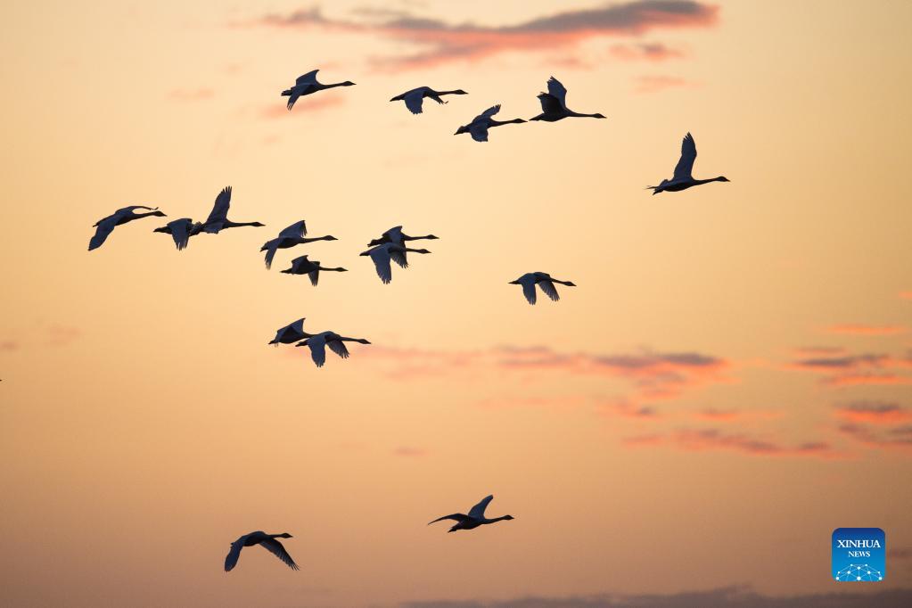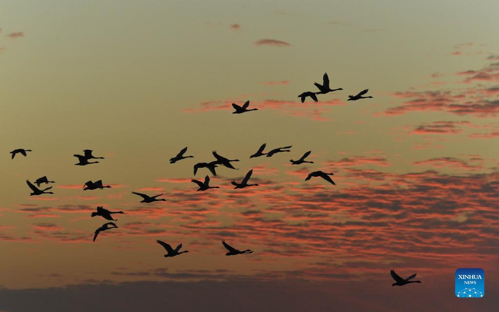 A flock of little swans fly at dawn in the Quyuan administration area in Yueyang City, central China's Hunan Province, Nov. 24, 2021. About 3,000 little swans have arrived at the Donggu Lake wetland of the Quyuan administration area in Yueyang for wintering. (Xinhua/Zhao Zhongzhi)