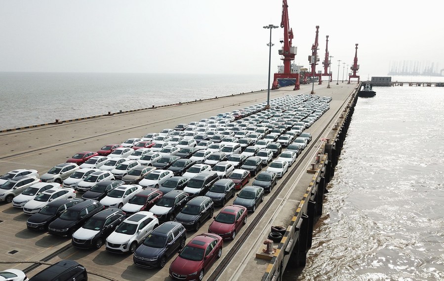 File photo taken on June 27, 2019 shows new cars waiting for shipment at a port in the Lingang area in Shanghai, east China. (Xinhua/Fang Zhe)