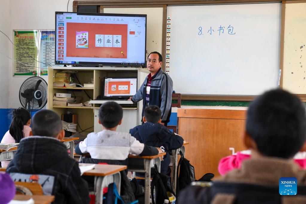 Jia Fuxian gives a class at a primary school in Jinji Township of Wuxuan County, south China's Guangxi Zhuang Autonomous Region, Nov. 25, 2021. The two brothers, Jia Fucai, 56, and Jia Fuxian, 46, work as teachers in the rural areas in the past 36 years and 26 years respectively. Knowing the importance of education for the rural children, the brothers, benefit from education in their younger age, chose to stay in the rural schools as teachers ignoring the difficult living conditions. (Xinhua/Cao Yiming)