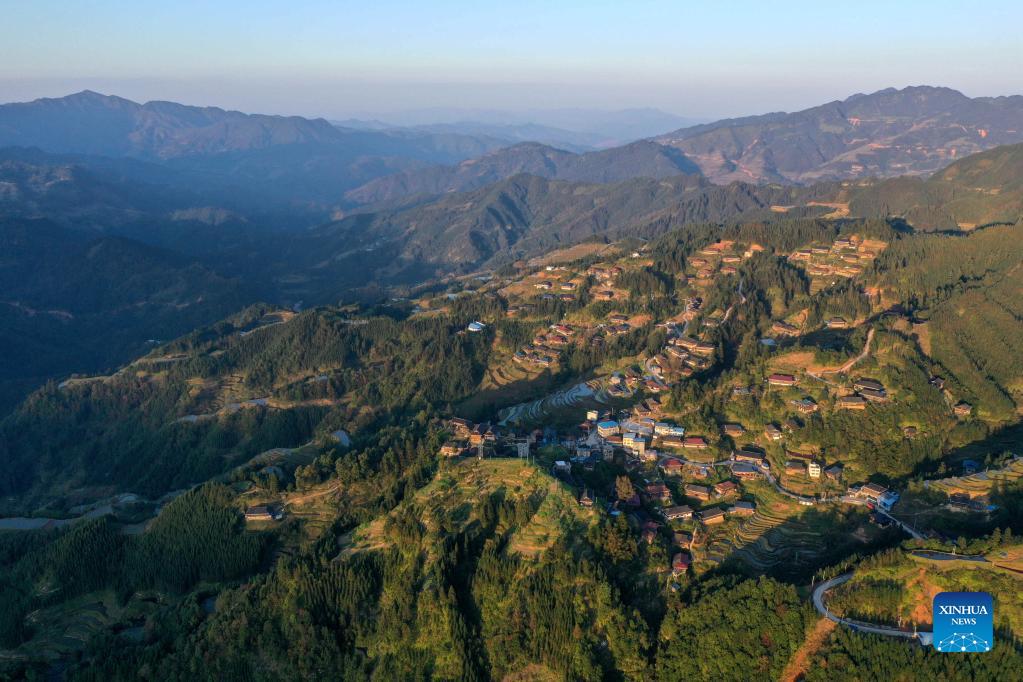 Aerial photo taken on Nov. 25, 2021 shows the winter scenery of Dangjiu Village in Gandong Township of Rongshui Miao Autonomous County, south China's Guangxi Zhuang Autonomous Region. (Xinhua/Huang Xiaobang)
