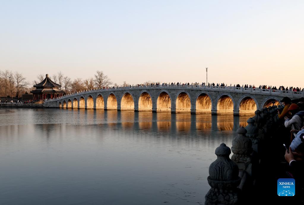 Photo taken on Nov. 25, 2021 shows the sunset illuminating the arches of the 17-Arch Bridge in the Summer Palace in Beijing, capital of China. (Xinhua/Chen Jianli)