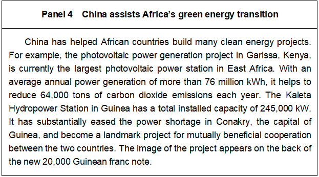– Contributing to industrialization in Africa. Industrialization is a prerequisite for the continent to achieve inclusive and sustainable development, and is also the key to creating jobs, eradicating poverty, and improving living standards. China supports African countries in improving their “soft” and “hard” environment for investment in accordance with their national conditions and development needs. Taking industrial alignment and capacity cooperation as the engine, China helps advance the process of Africa’s industrialization and economic diversification. To date, China has established industrial capacity cooperation mechanisms with 15 countries in Africa. China and African countries have worked together to build economic and trade cooperation zones, special economic zones, industrial parks and science parks, attracting enterprises from China and other countries to invest in Africa. They have built production and processing bases and localized their operations in Africa, contributing to an increase in local employment and tax revenues, and promoting industrial upgrading and technical cooperation. The China-Africa Fund for Production Capacity Cooperation has focused on the construction of highways, railways, and aviation networks, and industrialization in Africa. As of March 2021, investments had been made in 21 projects, covering energy, resources and manufacturing and boosting industrial development in recipient countries. Dozens of Chinese-funded enterprises have cooperated with African counterparts to build photovoltaic power stations, with a cumulative installed capacity exceeding 1.5 GW, which has helped create photovoltaic industry chains from scratch in Africa, while effectively alleviating power shortages and reducing carbon emissions.