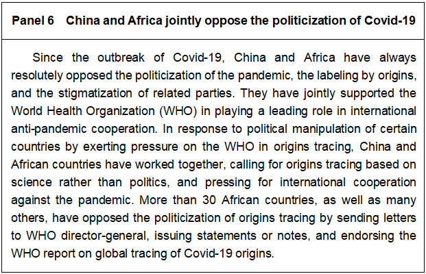 – Combating Covid-19 and building a China-Africa community of health for all. China will continue to provide anti-pandemic assistance to African countries, share its experience in coordinating routine epidemic prevention and control with social and economic development, and speed up cooperation with Africa on vaccines. China-Africa health cooperation is not a short-term measure, but a long-term and far-sighted strategy. It focuses on assisting Africa to improve its public health system and its capacity for controlling and preventing major communicable diseases, so as to promote a China-Africa community of health for all in the new era.