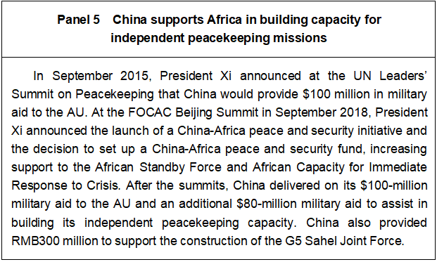 Since China first took part in UN peacekeeping operations in 1990, more than 80 percent of its peacekeepers have been deployed in Africa. Over 30,000 Chinese peacekeepers have been sent to Africa to perform tasks in 17 peacekeeping mission areas. More than 1,800 peacekeepers are currently performing missions in five of these areas – Mali, the Democratic Republic of the Congo (the DRC), Abyei, South Sudan and Western Sahara. In accordance with UN Security Council resolutions, the PLA Navy has deployed regular convoys in the Gulf of Aden since 2008. To date it has dispatched 39 escort taskforces, providing protection to approximately 7,000 Chinese and foreign vessels in about 1,400 groups. China also decided to donate 300,000 doses of Covid-19 vaccine to UN peacekeepers, with priority given to those in African mission areas. As of August 2020, a total of 11 Chinese military peacekeepers had sacrificed their lives for the noble cause of peace in Africa.