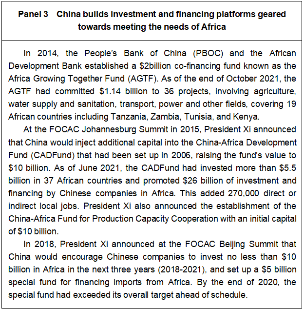 – Strengthening financial cooperation. Financial institutions from both sides have been exploring each other’s markets. Their central banks have expanded the scale of local currency settlement and currency swap, leading to a steady improvement in China-Africa financial facilitation. As of October 2021, the Cross-Border Interbank Payment System (CIPS) had 42 indirect participants in Africa, covering 19 African countries. The People’s Bank of China (PBOC), China’s central bank, has signed successive currency swap agreements with the central banks of South Africa, Morocco, Egypt and Nigeria, to a total amount of RMB73 billion. China has signed a memorandum of understanding on cooperation in financial supervision with seven African countries including Egypt, South Africa and Nigeria, laying a solid foundation for steady and long-term bilateral financial cooperation. China has joined the African Development Bank (AfDB), the Eastern and Southern African Trade and Development Bank, the West African Development Bank and other multilateral development financial institutions. It has pledged to contribute a total of $996 million to the African Development Fund under the AfDB.