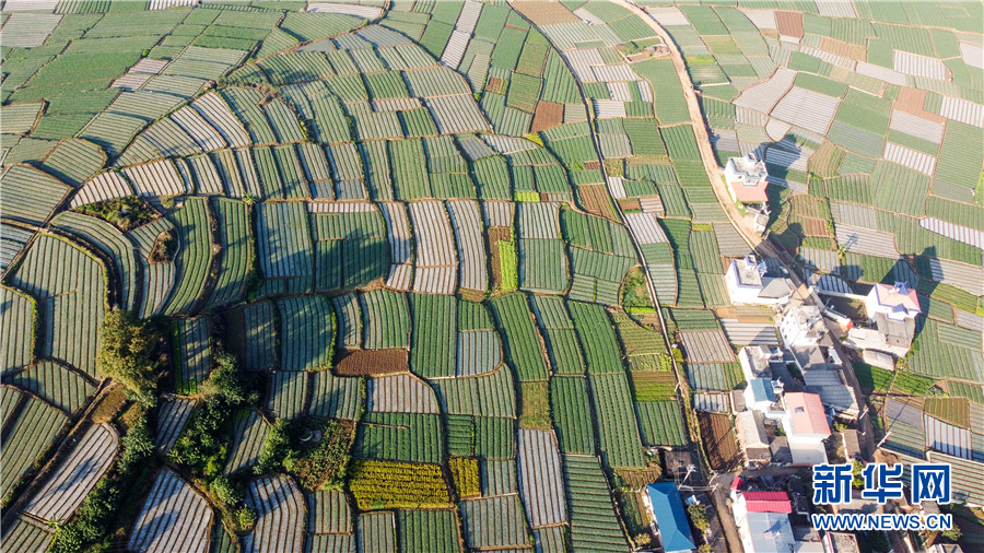 Aerial photo shows onion fields in Miandian Town of Jianshui County, Honghe Hani and Yi Autonomous Prefecture, southwest China's Yunnan Province. (Photo by Yang Junpeng/Xinhuanet)