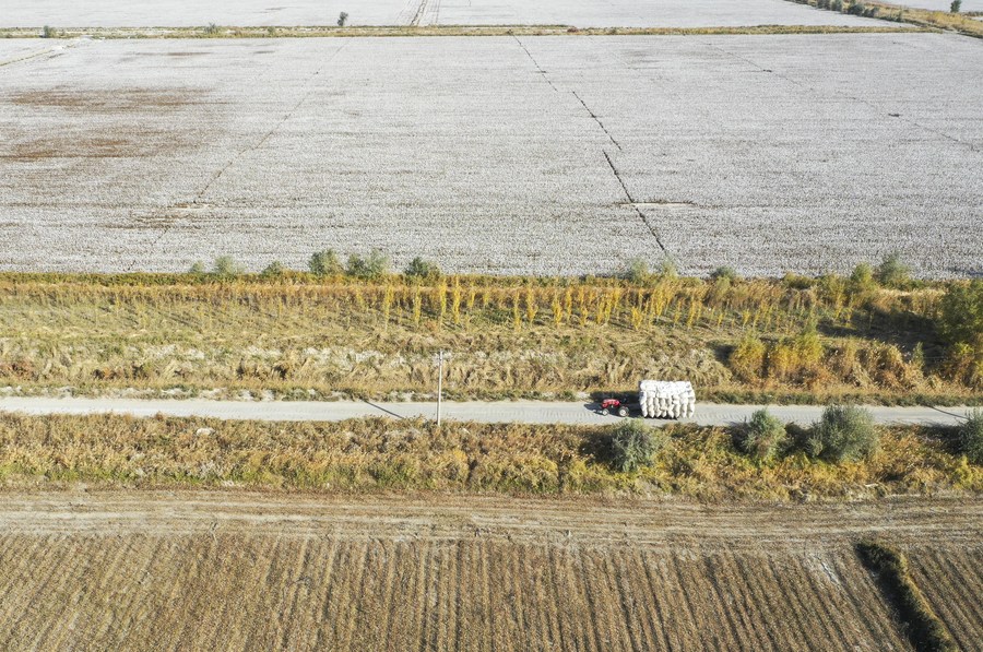 Aerial photo shows a farmer driving a tractor to transport cotton in Yuli County, northwest China's Xinjiang Uygur Autonomous Region, Oct. 22, 2021. (Xinhua/Zhao Ge)