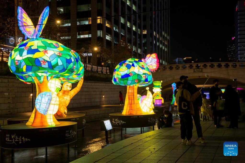 Visitors take selfies with lanterns during the 2021 Seoul Lantern Festival in Seoul, South Korea, Nov. 26, 2021. (Xinhua/Wang Yiliang)