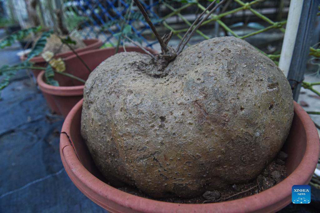 Photo taken on Nov. 17, 2021 shows the Stephania epigaea in Hainan Tropical Botanical Garden in Danzhou City, south China's Hainan Province. Hainan Tropical Botanical Garden, located in Danzhou of south China's Hainan, was founded in 1958 and is now affiliated with Chinese Academy of Tropical Agricultural Sciences. The garden, with over 2,600 kinds of tropical and subtropical plants collected from more than 40 countries and regions, is a treasure house of tropical plant resources including flowers, fruit trees, medicinal plants and economic plants, etc. (Xinhua/Pu Xiaoxu)