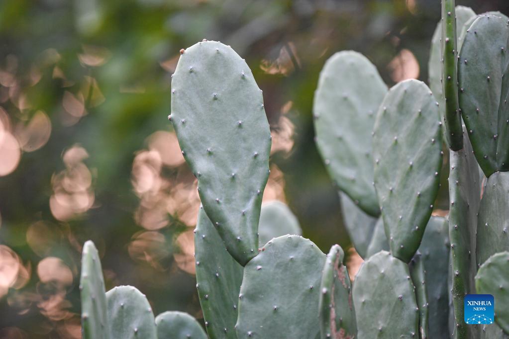 Photo taken on Nov. 18, 2021 shows the Nopalea auberi in Hainan Tropical Botanical Garden in Danzhou City, south China's Hainan Province. Hainan Tropical Botanical Garden, located in Danzhou of south China's Hainan, was founded in 1958 and is now affiliated with Chinese Academy of Tropical Agricultural Sciences. The garden, with over 2,600 kinds of tropical and subtropical plants collected from more than 40 countries and regions, is a treasure house of tropical plant resources including flowers, fruit trees, medicinal plants and economic plants, etc. (Xinhua/Pu Xiaoxu)