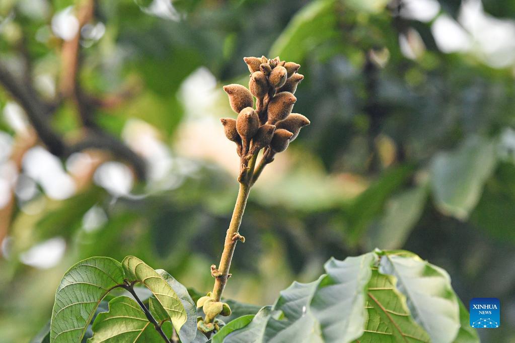 Photo taken on Nov. 18, 2021 shows the Markhamia stipulata in Hainan Tropical Botanical Garden in Danzhou City, south China's Hainan Province. Hainan Tropical Botanical Garden, located in Danzhou of south China's Hainan, was founded in 1958 and is now affiliated with Chinese Academy of Tropical Agricultural Sciences. The garden, with over 2,600 kinds of tropical and subtropical plants collected from more than 40 countries and regions, is a treasure house of tropical plant resources including flowers, fruit trees, medicinal plants and economic plants, etc. (Xinhua/Pu Xiaoxu)