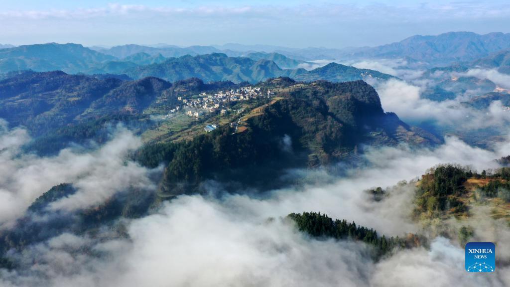 Aerial photo taken on Nov. 26, 2021 shows Angu Village amid morning mist in Fuquan City, Qiannan Buyi and Miao Autonomous Prefecture, southwest China's Guizhou Province. (Photo by Xiao Wei/Xinhua)