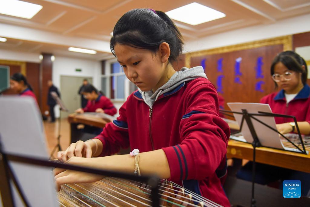 Students practice Guzheng, or Chinese zither, during their extra-curricular hours at a middle school in Xilinhot City in north China's Inner Mongolia Autonomous Region, on Nov. 26, 2021. Extra-curricular activities aim to meet the needs of different students and promote their healthy development. (Xinhua/Peng Yuan)