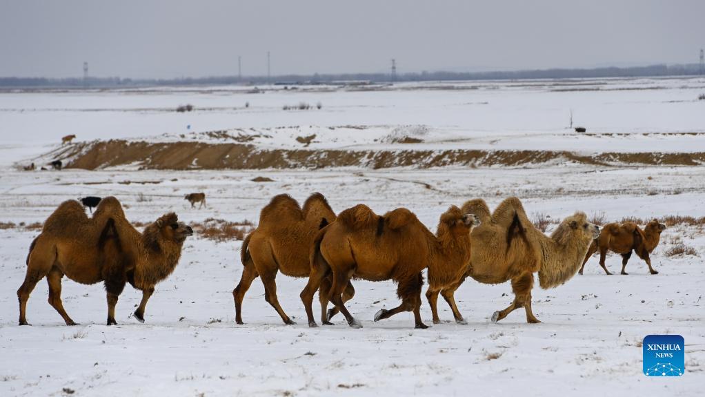 Camels forage on the pasture in Fuhai County of Altay, northwest China's Xinjiang Uygur Autonomous Region, Nov. 24, 2021. Fuhai, located in north Xinjiang, is an important stock farming base in the region, with unique geographical and climatic conditions especially suitable for camel breeding. In recent years, camel breeding has developed into a pillar industry under promotion policy in Fuhai. By establishing camel milk cooperatives, individual herders here are accessing the dairy market through unified and stable sales channels. In 2021, the number of camels in the county has totaled 22,300, among which 6,470 are dairy camels with a daily milk output of 12,500 kilograms. (Xinhua/Ding Lei)