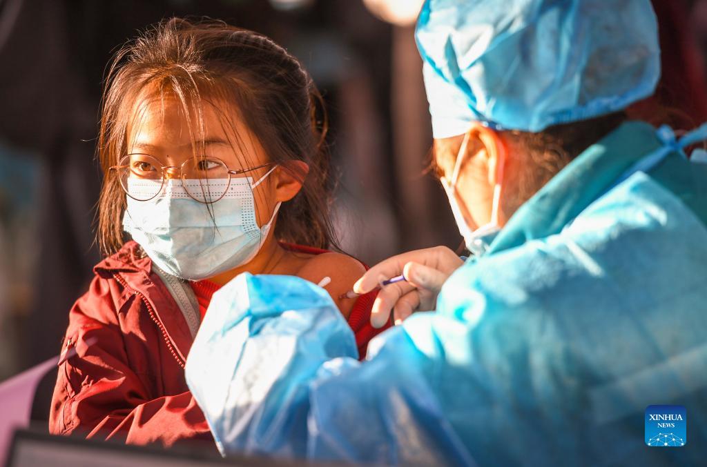 A kid receives a dose of COVID-19 vaccine at a school in Hohhot, north China's Inner Mongolia Autonomous Region, Nov. 23, 2021. Hohhot recently launched a COVID-19 vaccination campaign for children aged 3 to 11. (Xinhua/Peng Yuan)