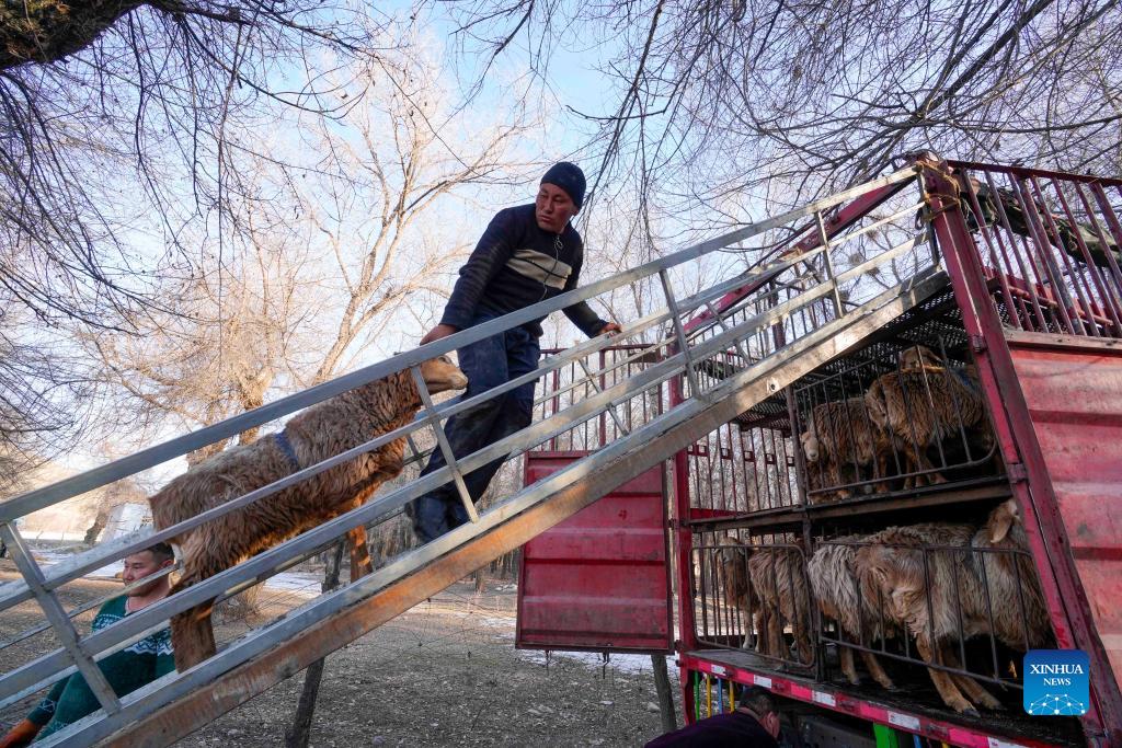 Herders load their livestock onto a truck as they move to winter pastures in Huocheng County, northwest China's Xinjiang Uygur Autonomous Region, Nov. 24, 2021. Local herders in Huocheng County are moving their livestock to winter pastures as the weather gets colder. (Xinhua/Zhao Ge)