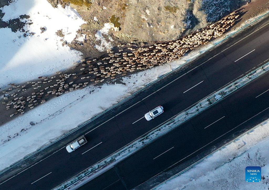 Aerial photo taken on Nov. 25, 2021 shows herders driving their livestock along an expressway as they head for winter pastures in Huocheng County, northwest China's Xinjiang Uygur Autonomous Region. Local herders in Huocheng County are moving their livestock to winter pastures as the weather gets colder. (Xinhua/Zhao Ge)