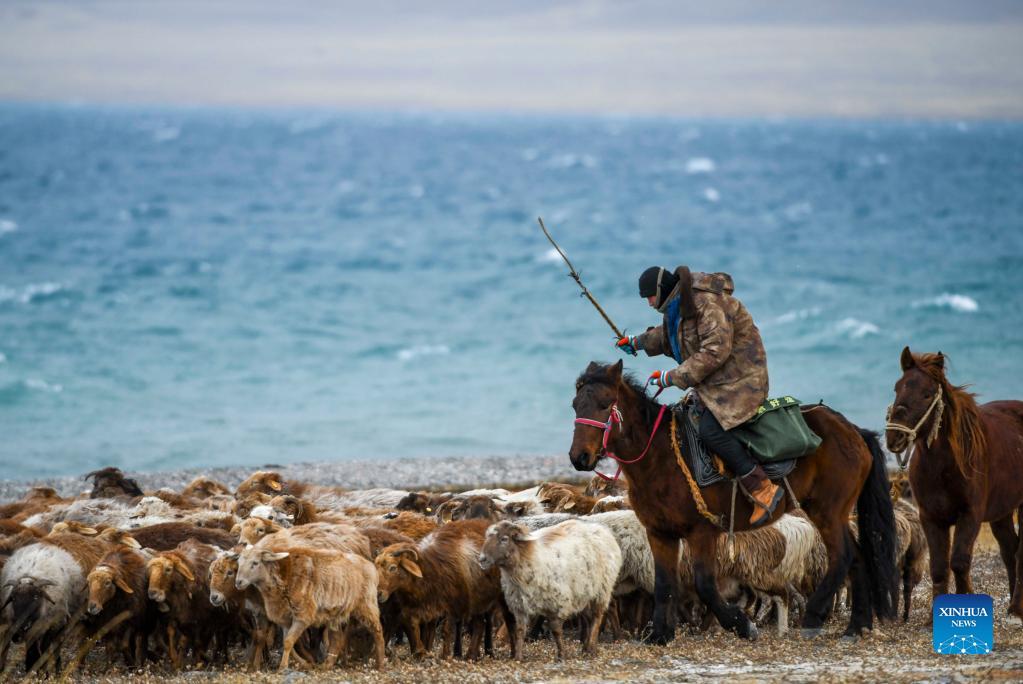 A herder drives his livestock by the Sayram Lake as they head for a winter pasture in Huocheng County, northwest China's Xinjiang Uygur Autonomous Region, Nov. 26, 2021. Local herders in Huocheng County are moving their livestock to winter pastures as the weather gets colder. (Xinhua/Zhao Ge)