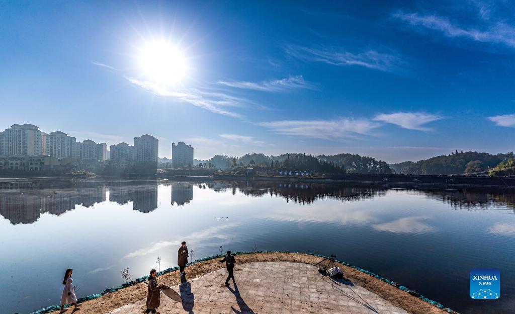 Photo taken on Nov. 25, 2021 shows the scenery of Lixiang Lake National Wetland Park in Nanchuan District, southwest China's Chongqing Municipality. Local authorities of Nanchuan District have in recent years made all-out efforts to strengthen ecological protection of Lixiang Lake. The endeavor has yielded blue skies and clear waters as well as booming tourism. (Photo by Qu Mingbin/Xinhua)