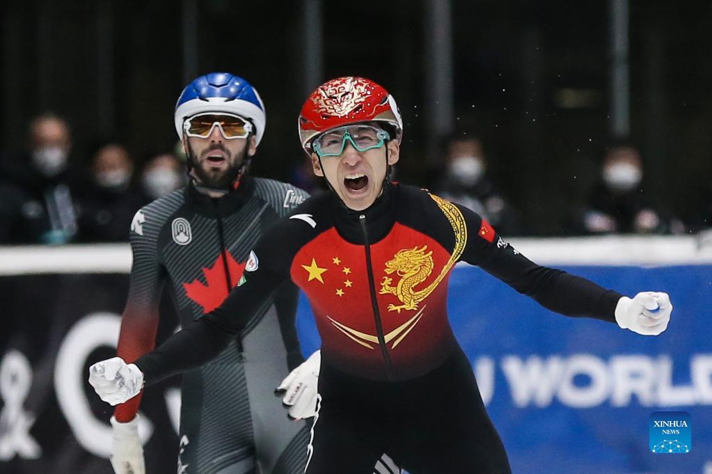 Wu Dajing (front) of China celebrates after the Final A of men's 500m race at the ISU World Cup Short Track Speed Skating series in Dordrecht, the Netherlands, Nov. 27, 2021. (Xinhua/Zheng Huansong)
