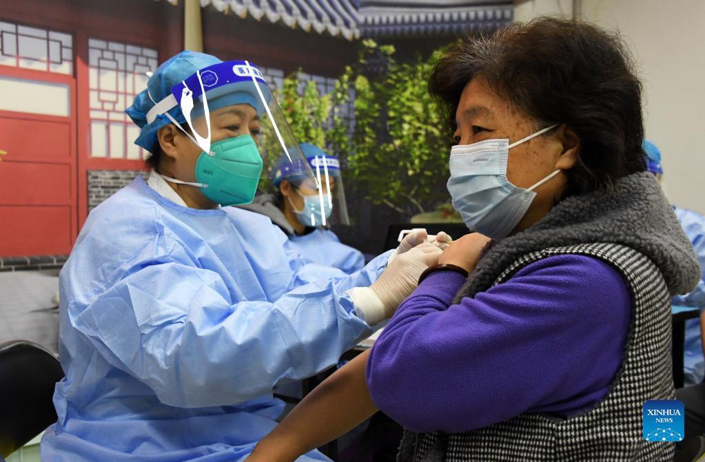Medical workers administer booster shots of COVID-19 vaccines to local residents at a temporary vaccination site in Beijing, capital of China, Nov. 29, 2021. (Xinhua/Ren Chao)