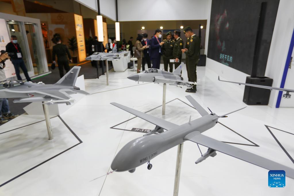 People stand near a model of ZDK-03 AWACS Aircraft at the booth of China Electronics Technology Group during an international defense expo in Cairo, Egypt, on Nov. 29, 2021. Egypt held on Monday the second edition of its largest international defense expo, EDEX 2021, with more than 400 defense companies from 42 countries, including China, showcasing their up-to-date defense products. (Xinhua/Sui Xiankai)