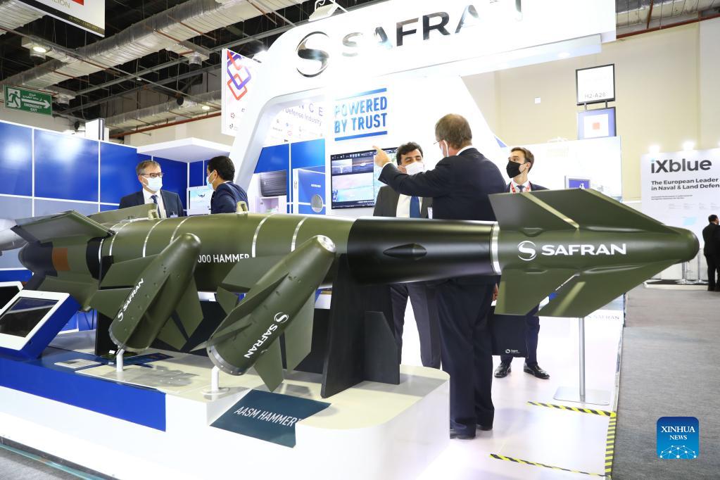 People visit the France's exhibition area during an international defense expo in Cairo, Egypt, on Nov. 29, 2021. Egypt held on Monday the second edition of its largest international defense expo, EDEX 2021, with more than 400 defense companies from 42 countries, including China, showcasing their up-to-date defense products. (Xinhua/Ahmed Gomaa)